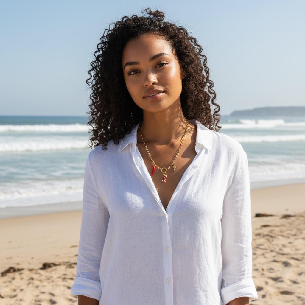 This charm necklace boasts three charms which nod to a day in the life of a cowgirl! The charms - a cowgirl boot, a pistol and a chilli - are attached to a fashionable 18kt golden paperclip chain, which fastens at the front or back. It is a sassy piece which is bound to get attention, and can be worn on any occasion.